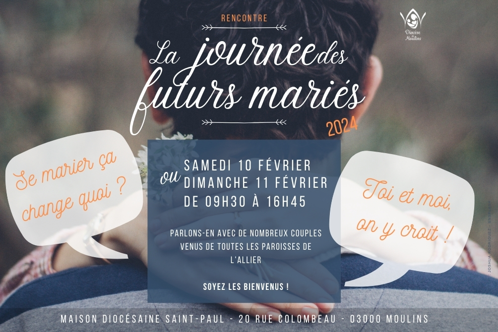 La journée des futurs mariés aura lieu le samedi 10 février OU le dimanche 11 février 2024 de 9h30 à 16h45 à la maison diocésaine Saint-Paul.