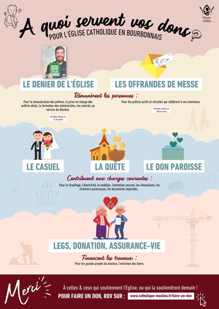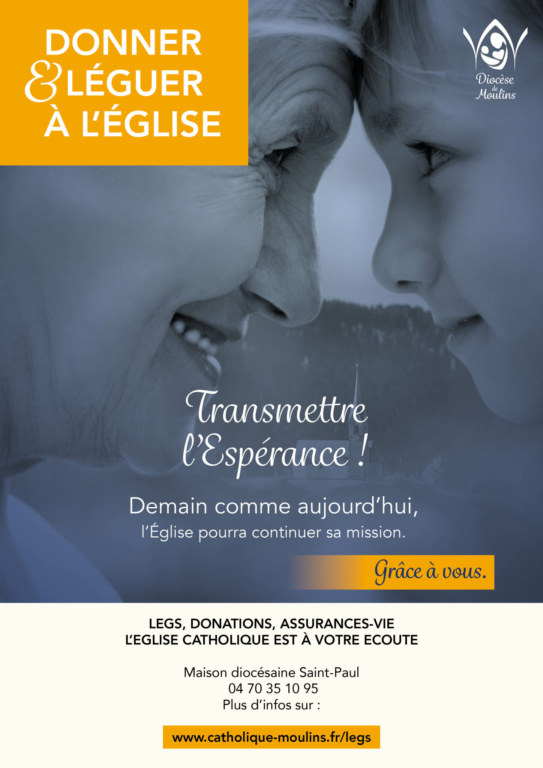 Donner à l’Eglise, c’est reconnaître que l’Eglise vous apporte, qu’elle vous donne ce qu’elle a de plus précieux. Donner c’est manifester une participation consciente à la mission de l’Eglise, c’est un signe de communion pour que l’Evangile continue à être annoncé, pour que le Christ continue à être connu et que l’Eglise Catholique en Bourbonnais puisse répondre à celles et ceux qui se tournent vers elle.