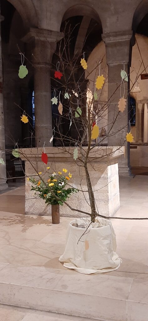 En conclusion de cette journée, chaque participant a été invité à prendre deux engagements écologiques de son choix et à les porter devant le Seigneur au cours des vêpres. Au pied de l’autel, quelques branches se sont parées de feuilles et rendez-vous a été pris pour poursuivre cette dynamique et nous mettre en route pour 2026 avec plus de participants et plus d’actions notamment au niveau des paroisses car « Il faut espérer que l’humanité du début du XXIème siècle pourra rester dans les mémoires pour avoir assumé avec générosité ses graves responsabilités. »(LS 169)