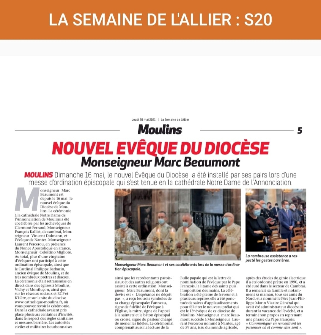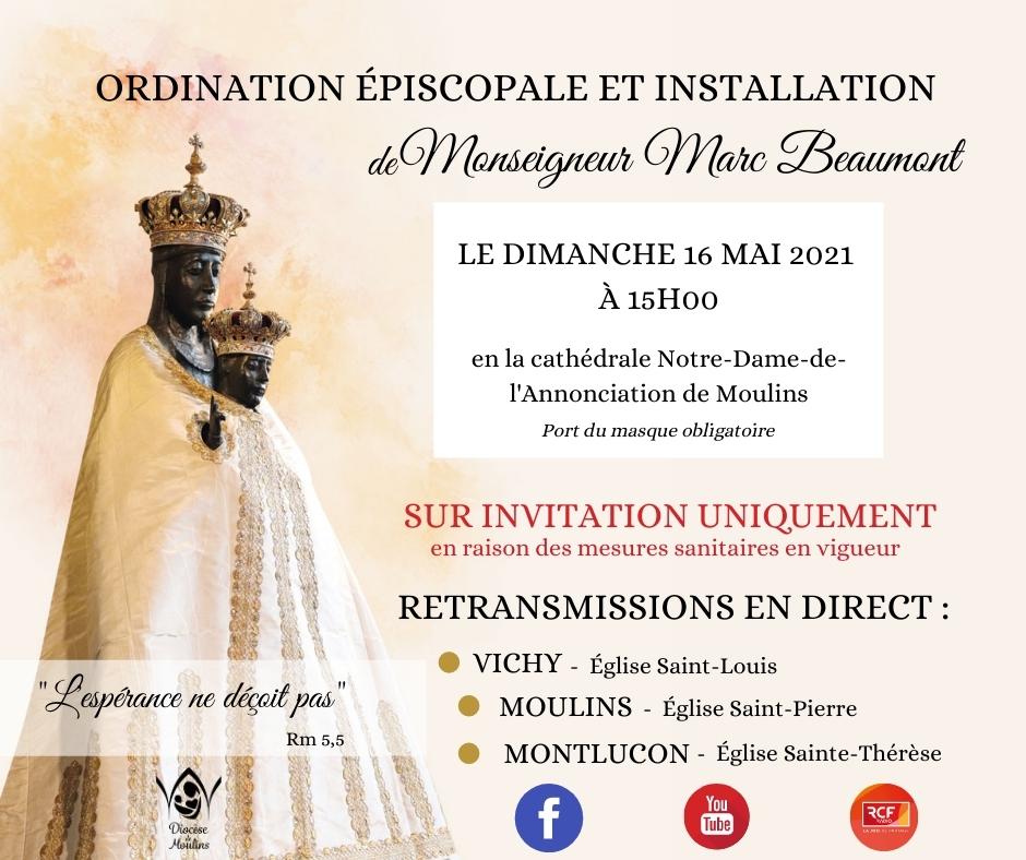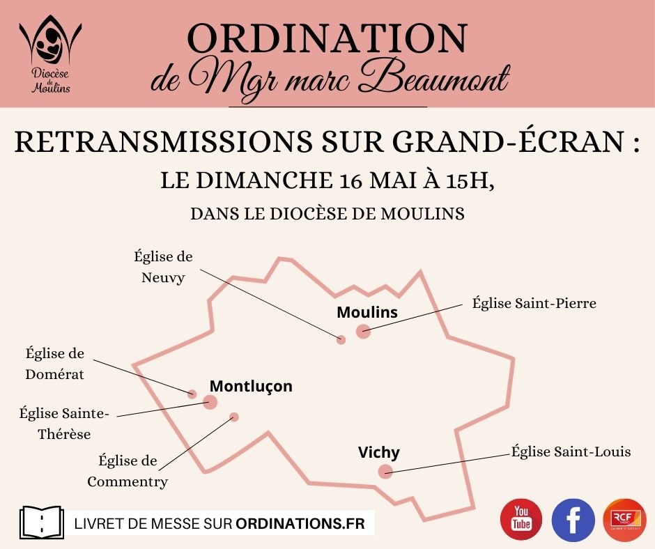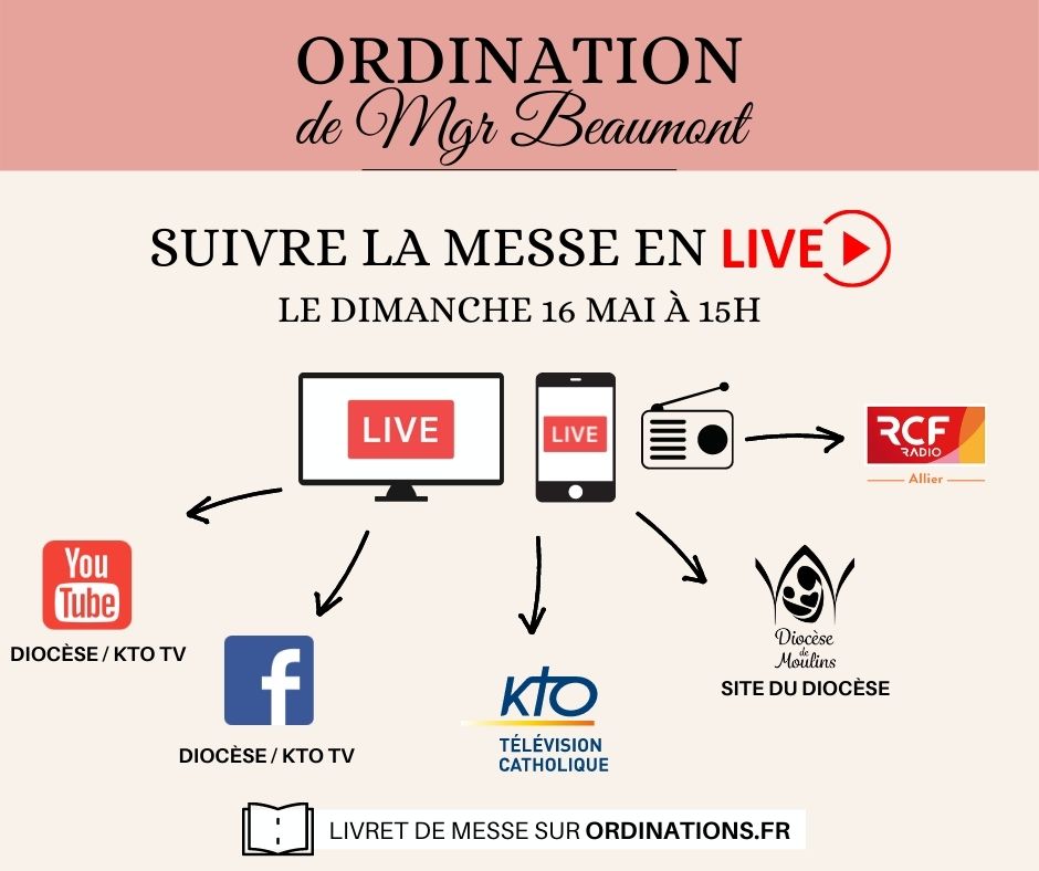 Sur la page Facebook du diocèse, la chaine youtube du diocèse, et celle de Kto TV, ainsi que sur RCF Allier et Ordinations.fr