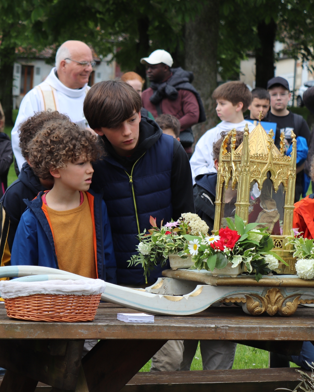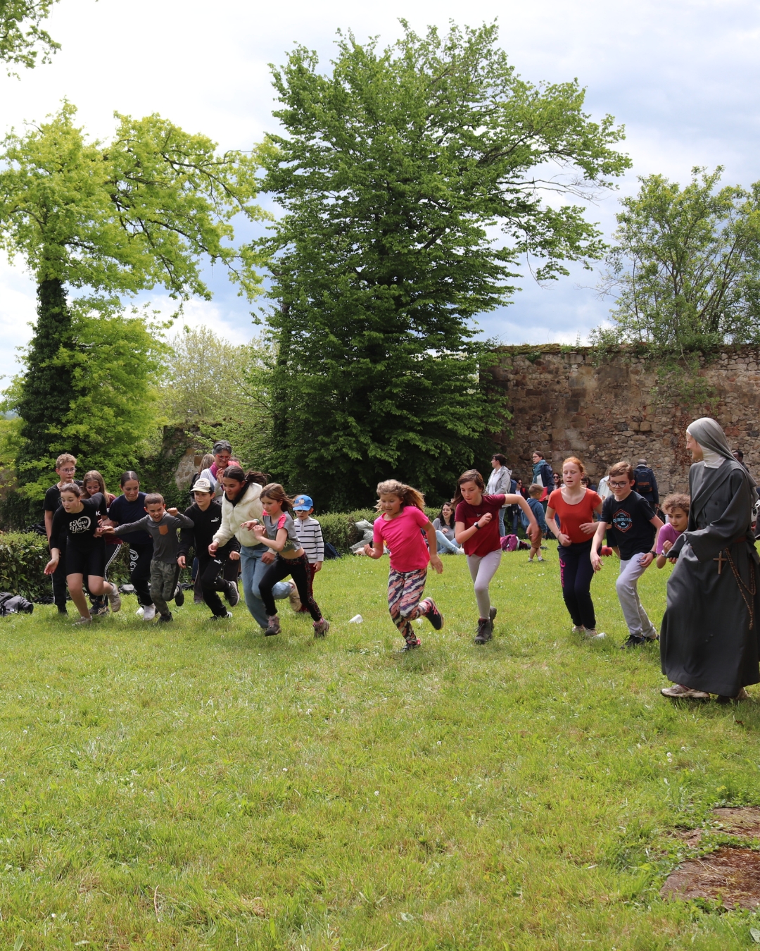 Malgré une météo capricieuse, nous avons répondu présents avec nos enfants pour péleriner jusqu’à Souvigny depuis Coulandon. Pour effectuer les 8 kilomètres, pas de bottes, mais des chaussures de rechange à l’arrivée ont été nécessaires, tant les chemins étaient gorgés d’eau. Au final, seulement quelques gouttes, le temps s’était invité à la paix avec des couleurs exceptionnelles. Nous avons eu la chance de nous retrouver dans le chapitre avec sœur Laura-Agnès aux commandes (communauté Saint-Jean à Vichy). Quelle grâce ! De beaux temps de méditation, de chapelets et autres temps de silence avons-nous pu vivre ! Le rassemblement de tous ces pèlerins pour la procession était remarquable. Après une brève pause déjeuner, place aux répétitions de chants pour quelques-uns de nos enfants, de jeux pour les autres du côté de la maison Saint-Odilon, tout était minuté ! Mais cela en valait la peine. La prestation de la chorale Rejoyce orchestrée par Anne Jouannard était magnifique. Une pause alors pour les parents s’imposait et nous n’avons donc pu suivre la conférence… C’était aussi pour vivre pleinement la messe de 15h30 et ce message de paix relayé par notre archevêque, Mgr Kalist avant de retrouver un beau soleil pour ponctuer une journée en tous points réussie. Bref, ce fut une ribambelle de grâces, merci Seigneur !