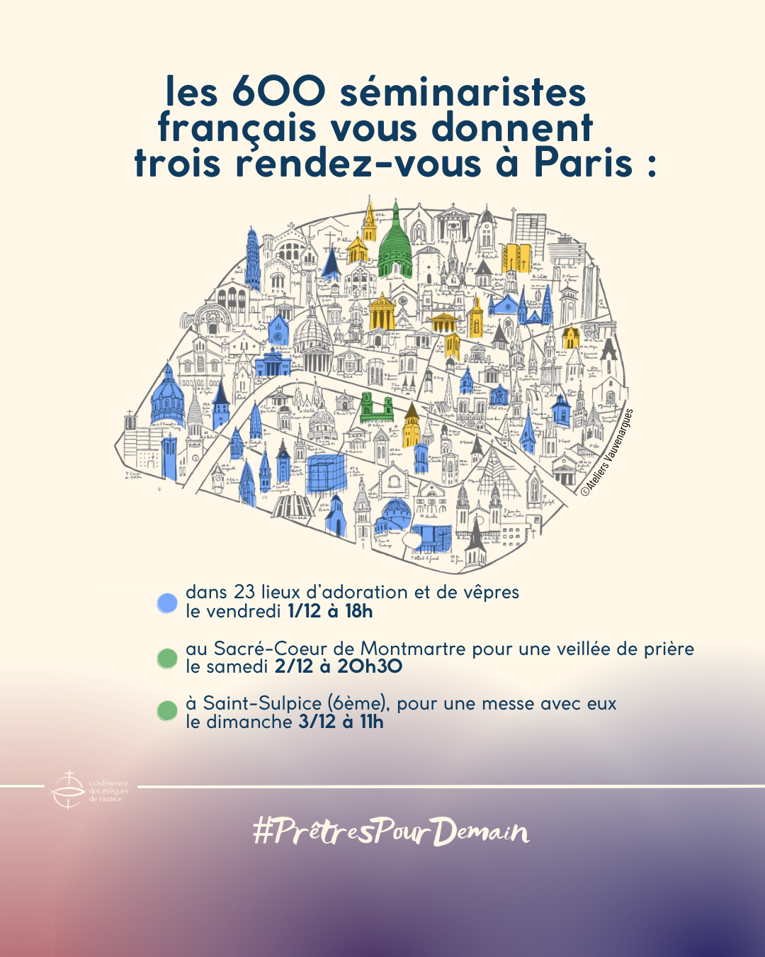 Une neuvaine de prière pour la conversion missionnaire et pour les vocations nous est proposée du vendredi 24 novembre au samedi 2 décembre 2023 pour accompagner le pèlerinage de 600 séminaristes de France à Paris. Une neuvaine, c’est une série de prières ou d’exercices de piété répétées pendant neuf jours consécutifs.
