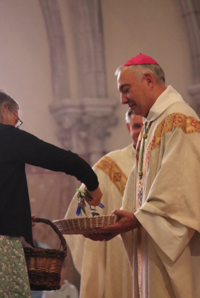 Les maires présents apportent les clés des églises de la paroisse à l’évêque qui les remet au nouveau curé.
