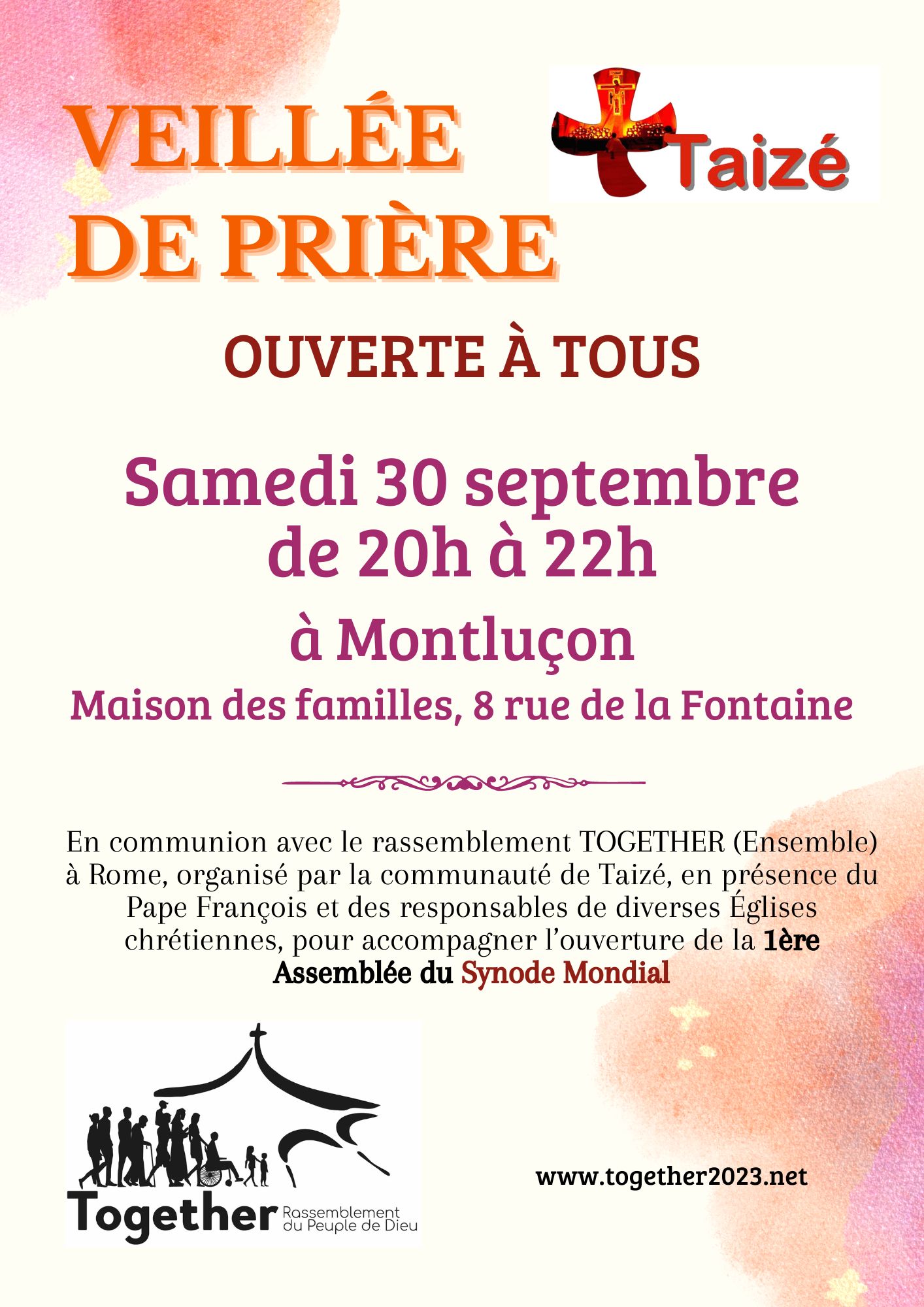 Veillée de prière le samedi 30 septembre, à 20h00, 8 rue de la Fontaine à Montluçon